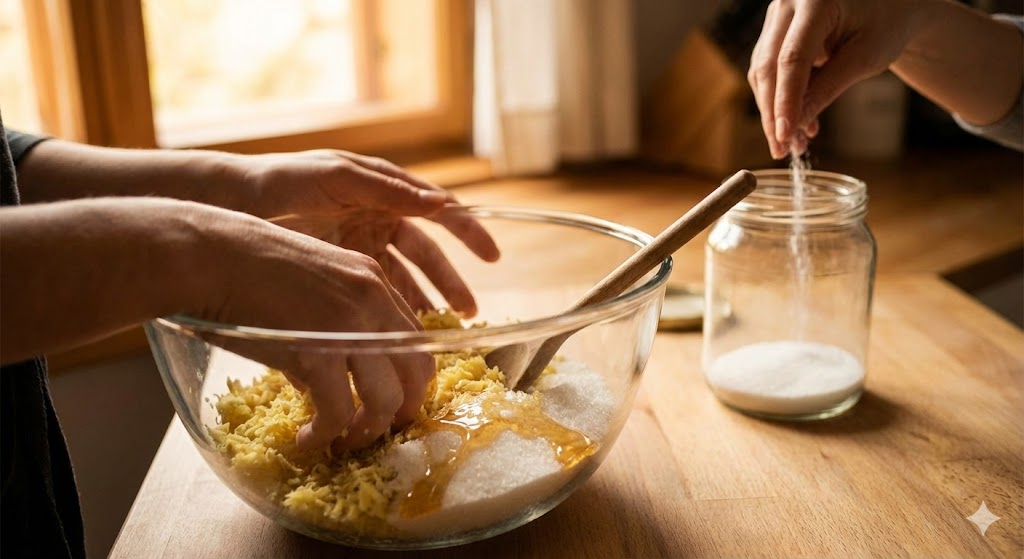 - 설탕과 생강 버무리기: 착즙된 생강액(혹은 얇게 썬 생강)에 준비된 설탕과 꿀을 모두 넣고 잘 버무려줍니다. 설탕이 녹지 않아도 괜찮습니다. 이 상태로 잠시 두면 생강에서 수분이 빠져나와 설탕이 자연스럽게 녹기 시작합니다.