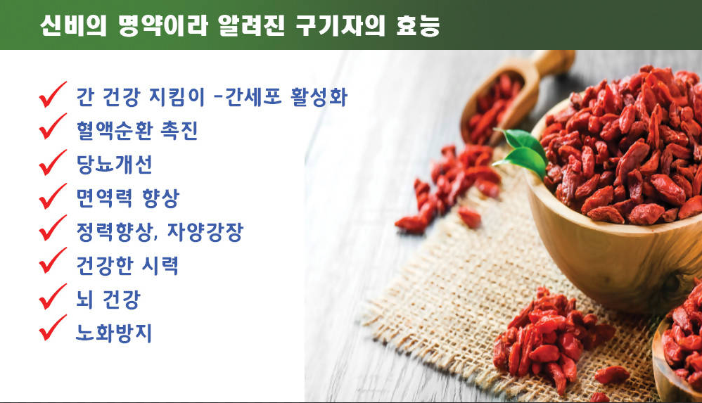 - 꿀팁: 건조된 구기자를 약한 불에 살짝 볶으면 구기자 특유의 비린 맛이 사라지고 고소한 맛이 살아납니다. 또한 유효 성분의 추출이 더 잘 됩니다.