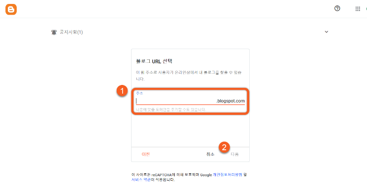 제목 다음에는 주소(URL)를 설정해야 합니다. 원하는 주소를 영문으로 입력하면 'blogspot.com'이라는 도메인이 뒤에 붙습니다. 이미 다른 사람이 사용 중인 주소는 사용할 수 없으므로, 사용 가능한 주소라는 메시지가 뜰 때까지 숫자나 단어를 조합하여 고유한 주소를 만들어야 합니다. 한번 정하면 변경이 번거로울 수 있으니 신중하게 결정하세요.