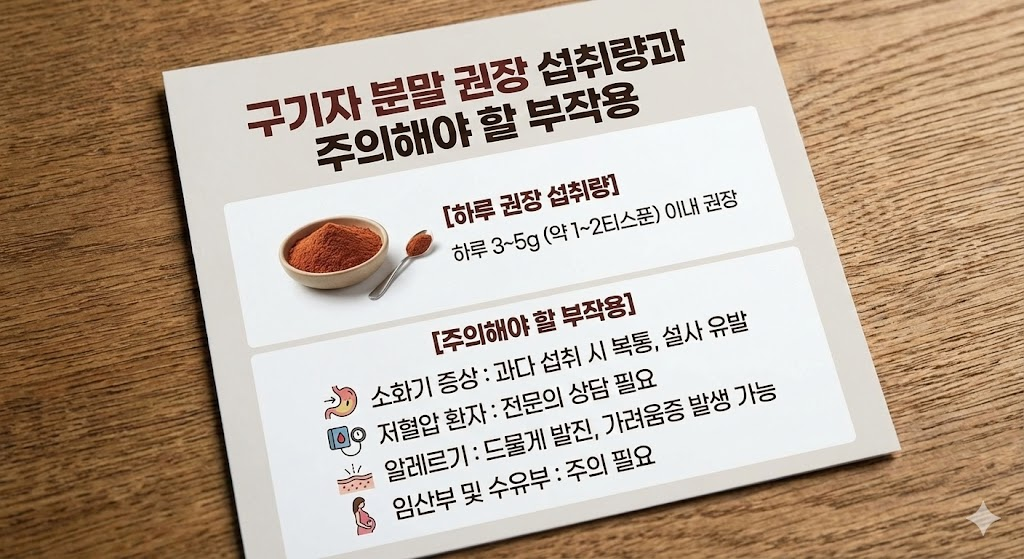 [하루 권장 섭취량] 일반적으로 구기자 분말은 하루 3~5g(약 1~2티스푼) 이내가 적당합니다.