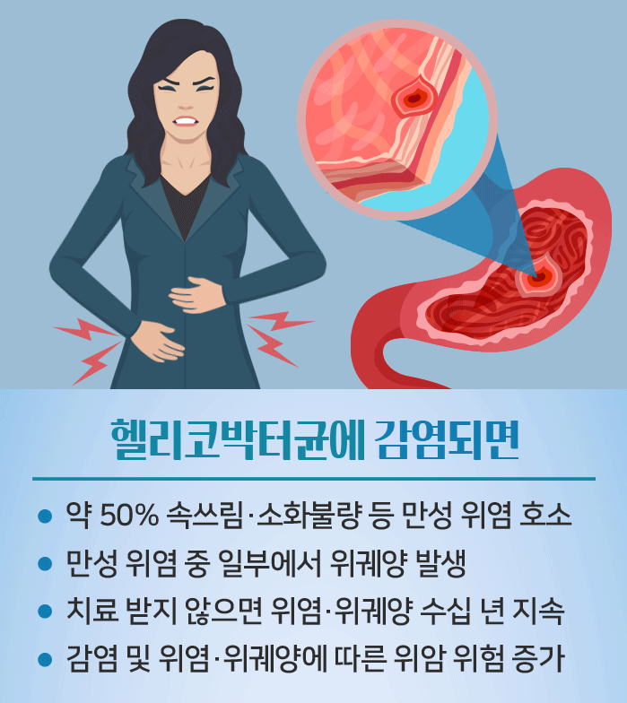 - 위험성: 헬리코박터균은 만성 위염, 소화성 궤양(위궤양 및 십이지장궤양)의 주요 원인이며, 특히 세계보건기구(WHO)가 지정한 1급 발암물질로, 위암 발생 위험을 2~6배 높이는 것으로 알려져 있습니다.