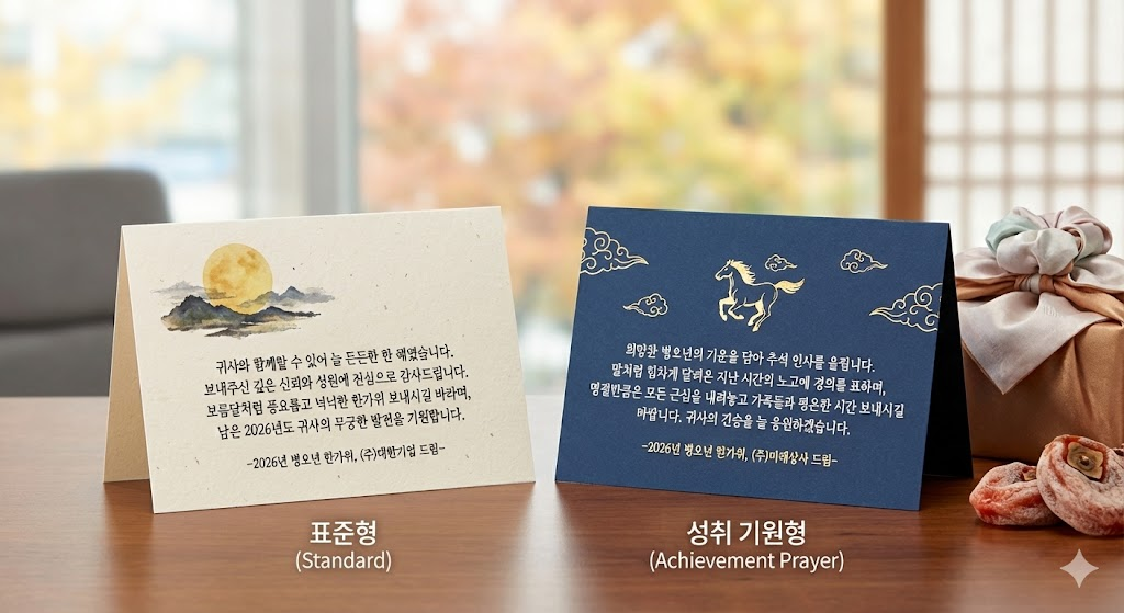 - 표준형: "귀사와 함께할 수 있어 늘 든든한 한 해였습니다. 보내주신 깊은 신뢰와 성원에 진심으로 감사드립니다. 보름달처럼 풍요롭고 넉넉한 한가위 보내시길 바라며, 남은 2026년도 귀사의 무궁한 발전을 기원합니다."