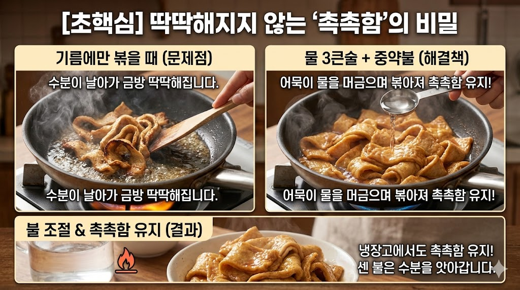- 불 조절: 처음부터 끝까지 중약불을 유지하세요. 센 불은 어묵 표면을 태우고 수분을 순식간에 앗아갑니다.