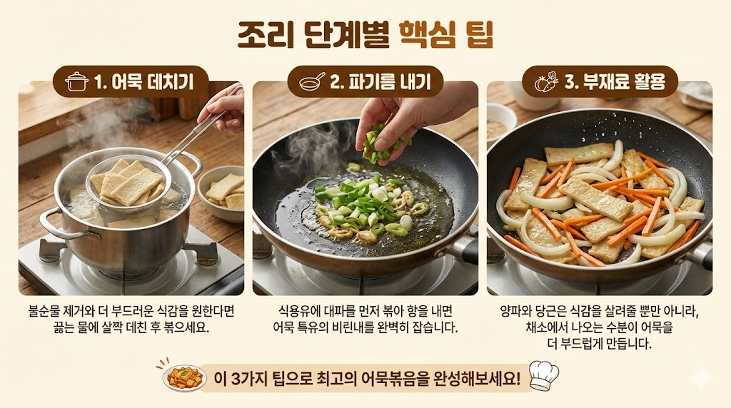 - 어묵 데치기: 불순물 제거와 더 부드러운 식감을 원한다면 끓는 물에 살짝 데친 후 볶으세요.