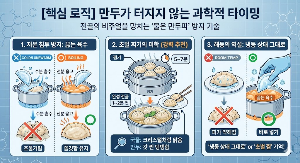 전골의 비주얼을 망치는 주범은 '불은 만두피'입니다. 이를 방지하는 전문가의 기술은 다음과 같습니다.