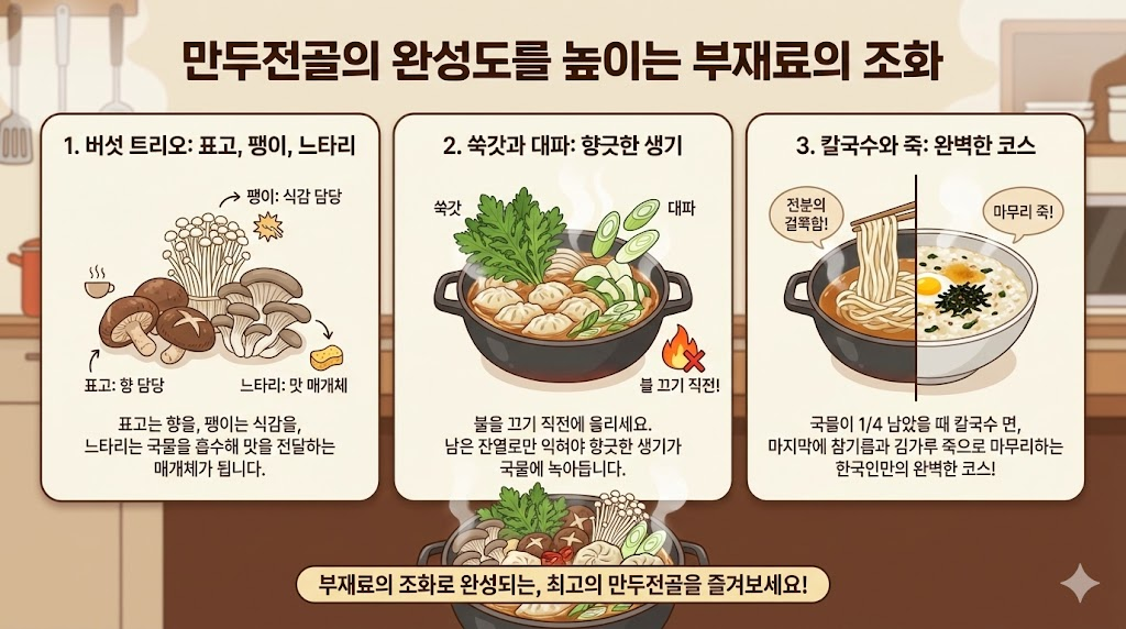 - 버섯 트리오: 표고, 팽이, 느타리버섯을 섞으세요. 표고는 향을, 팽이는 식감을, 느타리는 국물을 흡수해 맛을 전달하는 매개체가 됩니다.