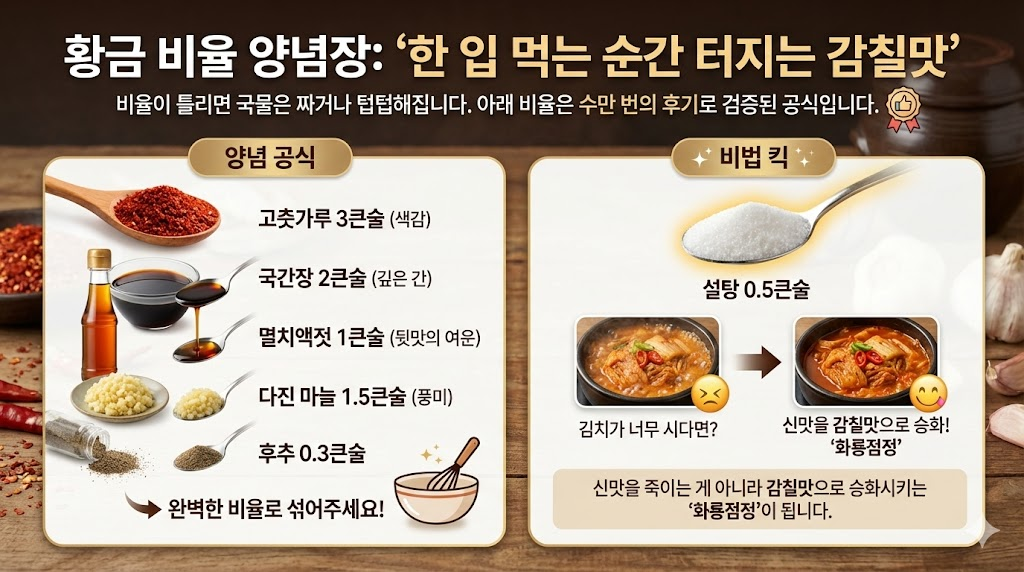 비율이 틀리면 국물은 짜거나 텁텁해집니다. 아래 비율은 수만 번의 후기로 검증된 공식입니다.