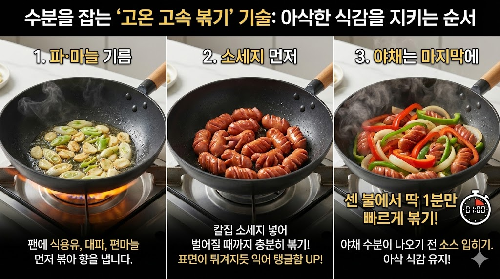 - 소세지 먼저: 칼집을 낸 소세지를 먼저 넣어 칼집이 벌어질 때까지 충분히 볶으세요. 이때 소세지 표면이 살짝 튀겨지듯 익어야 식감이 탱글해집니다.
