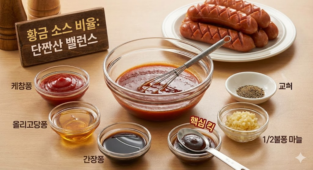 - 황금 배합 (소세지 200g 기준): 케첩 3큰술, 올리고당 1.5큰술, 진간장 1큰술, 굴소스 0.5큰술(핵심 킥), 다진 마늘 0.5큰술, 후추 약간.