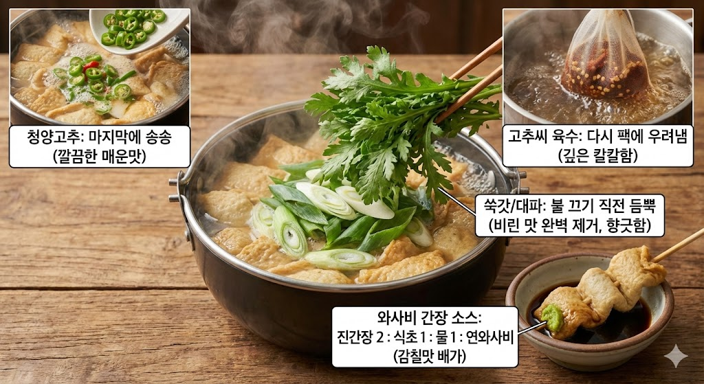 - 쑥갓과 대파: 불을 끄기 직전에 듬뿍 올리세요. 쑥갓의 향긋함이 어묵의 비린 맛을 완벽하게 잡아줍니다.