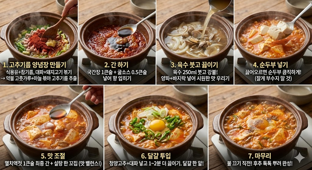 순두부찌개는 일반 찌개와 달리 양념장(다대기)을 볶는 과정이 맛의 90%를 결정합니다.