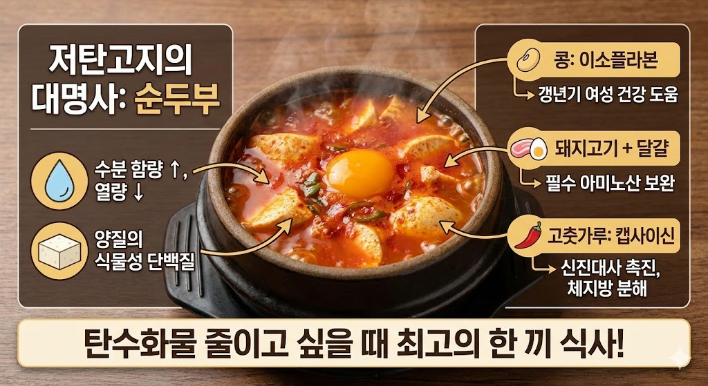 순두부는 수분 함량이 높아 열량이 낮으면서도 양질의 식물성 단백질을 제공합니다. 콩의 이소플라본 성분은 갱년기 여성 건강에 도움을 주며, 함께 들어가는 돼지고기와 달걀은 필수 아미노산을 보완해줍니다. 또한 고춧가루의 캡사이신은 신진대사를 촉진하여 체지방 분해를 돕는 효과가 있어, 탄수화물을 줄이고 싶을 때 최고의 한 끼 식사가 됩니다.