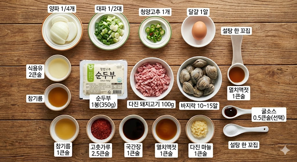 - 메인 재료: 순두부 1봉(350g), 다진 돼지고기 100g, 바지락 10~15알