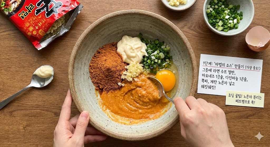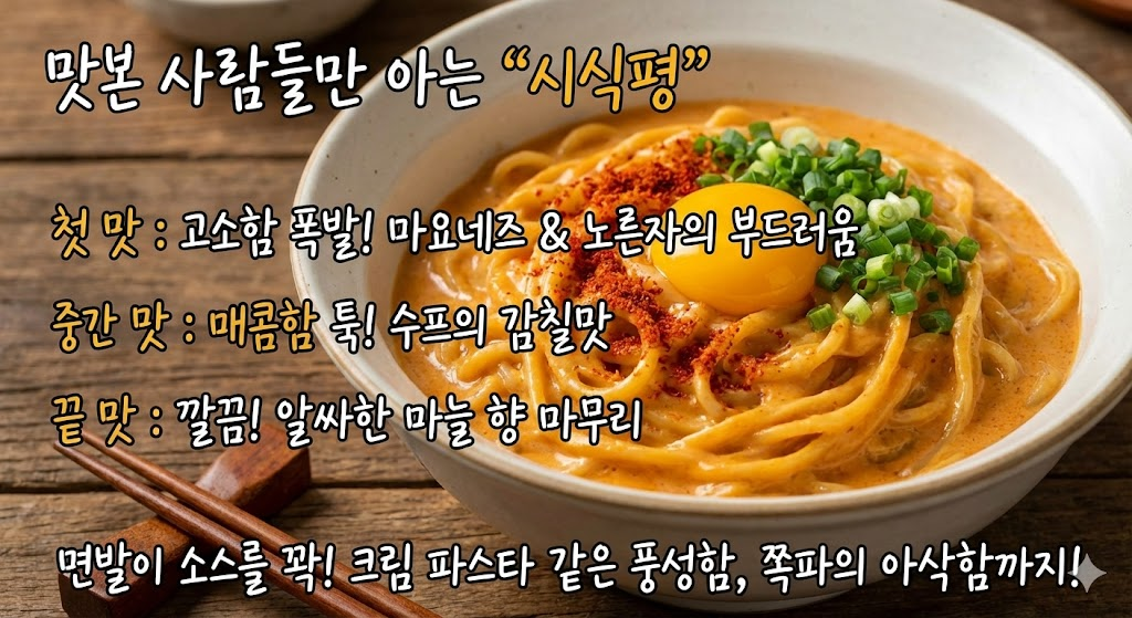 이 레시피의 핵심은 **'감칠맛의 대폭발'**입니다. 우리가 흔히 먹는 라면 수프에 마요네즈와 계란 노른자가 더해지면, 매운맛은 중화되면서 고소함은 10배로 살아나요. 마치 일본의 유명한 '돈코츠 라멘'이나 꾸덕한 '카르보나라'를 섞어놓은 듯한 맛이 난답니다.