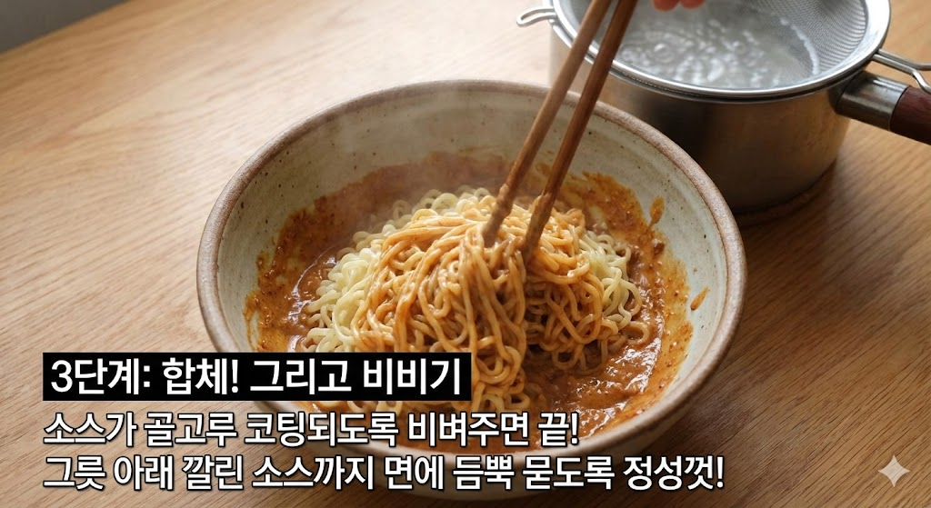 - 치즈 추가: 더 꾸덕한 맛을 원한다면 슬라이스 치즈 한 장을 면 위에 올리고 비벼보세요.