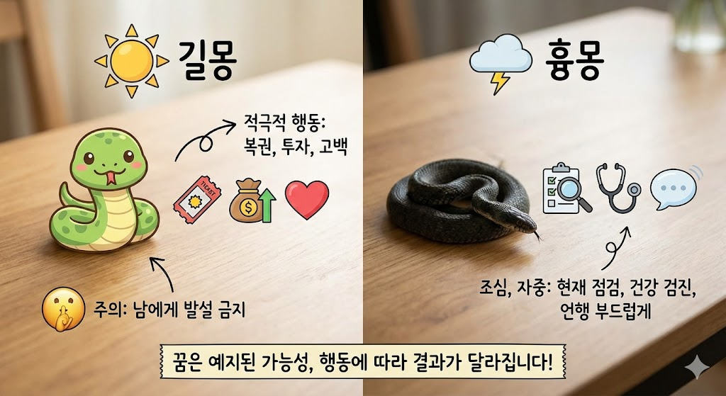 뱀 꿈은 무의식이 보내는 강렬한 신호입니다. 길몽이라 생각된다면 적극적으로 행동하십시오. 복권을 사거나, 미뤄왔던 투자를 하거나, 고백하는 등 기회를 잡아야 합니다. 또한, 길몽은 남에게 발설하면 그 기운이 흩어진다는 속설이 있으니 주의하는 것이 좋습니다. 반면 흉몽이라 느껴진다면, 매사에 조심하고 자중해야 합니다. 새로운 일을 벌이기보다는 현재 상황을 점검하고, 건강 검진을 받거나 대인관계에서의 언행을 부드럽게 하는 등 예방적인 태도가 필요합니다. 꿈은 결정된 미래가 아니라 예지 된 가능성이므로, 당신의 행동에 따라 결과는 충분히 달라질 수 있습니다. 결론적으로 뱀 꿈해몽은 단순한 미신을 넘어, 자신의 현재 심리 상태와 다가올 운의 흐름을 읽는 중요한 도구입니다. 이 글에서 다룬 다양한 해몽 사례를 통해 여러분의 꿈이 암시하는 바를 정확히 파악하고, 다가올 행운은 잡고 불운은 피해 가는 지혜를 발휘하시길 바랍니다.