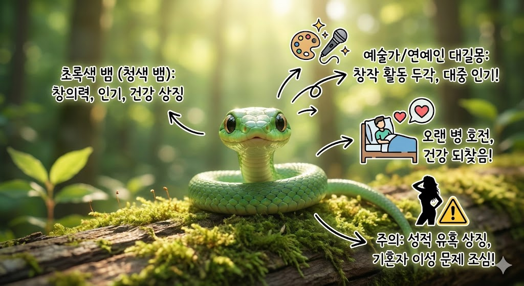 초록색 뱀은 창의력, 인기, 건강을 상징합니다. 예술가나 연예인에게 매우 좋은 꿈이며, 대중의 인기를 얻거나 창작 활동에서 두각을 나타내게 됩니다. 혹은 오랫동안 앓던 병이 호전되어 건강을 되찾는 것을 의미하기도 합니다. 다만, 초록 뱀은 성적인 유혹을 상징하기도 하므로 기혼자는 이성 문제에 주의해야 합니다.