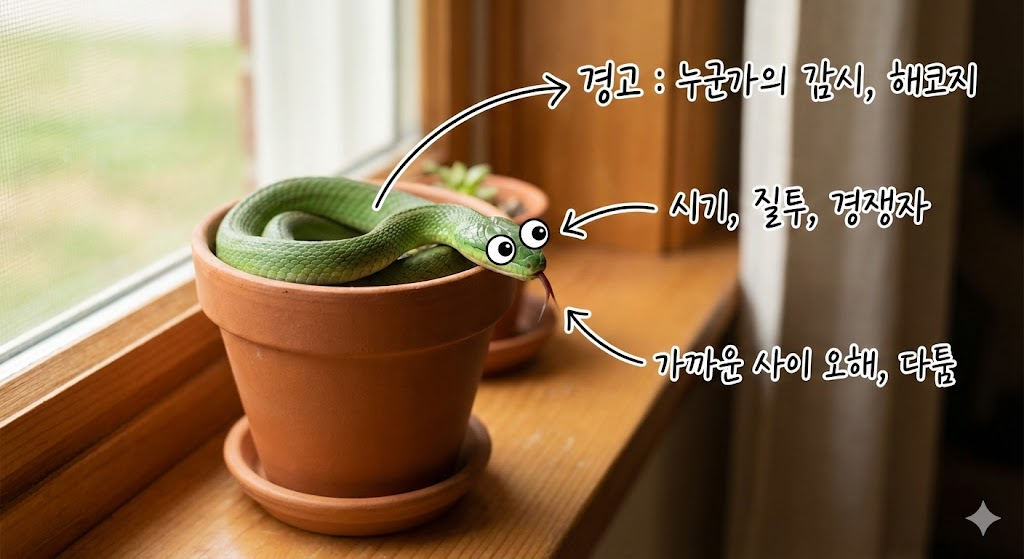 뱀은 때로 교활한 인물이나 질병, 유혹을 상징하기도 합니다. 다음과 같은 상황에서는 신변 관리에 각별한 주의가 필요합니다.