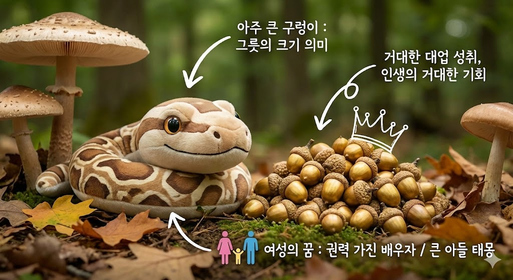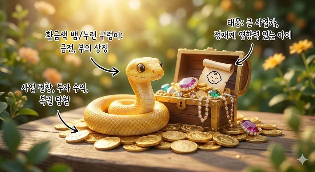 * 큰 구렁이: 대개 아들로 해석되며, 리더십이 강하고 큰일을 할 인물이 됩니다. 정치인, 사업가, 장군 등의 기질을 타고납니다.