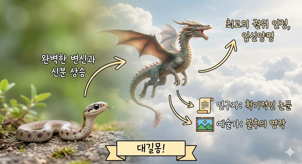 뱀이 용으로 변하는 것은 완벽한 변신과 신분 상승을 의미합니다. 자신의 분야에서 최고의 권위를 인정받게 되며, 입신양명하여 이름을 널리 알리게 됩니다. 연구자라면 획기적인 논문을, 예술가라면 불후의 명작을 남기게 될 대길몽입니다.