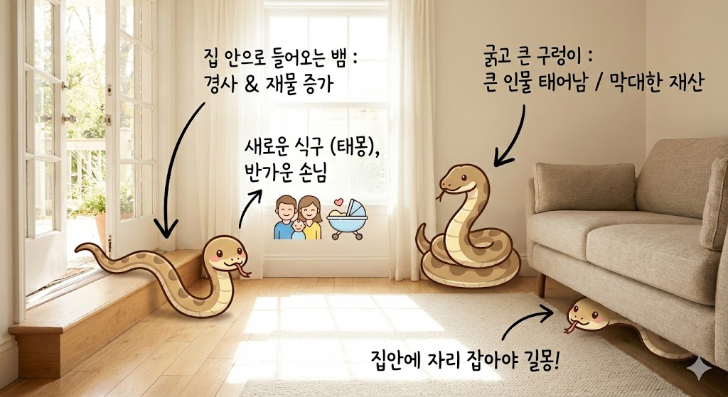 뱀이 집 안으로 들어오는 꿈은 집안에 경사가 생기거나 재물이 불어날 징조입니다. 새로운 식구(태몽 포함)가 늘어나거나, 반가운 손님이 찾아올 수 있습니다. 특히 굵고 큰 구렁이가 들어오는 꿈은 집안을 일으킬만한 큰 인물이 태어나거나 막대한 재산이 들어옴을 암시합니다. 다만, 들어온 뱀이 다시 밖으로 나가지 않고 집안 어딘가에 자리를 잡아야 길몽으로 해석됩니다.