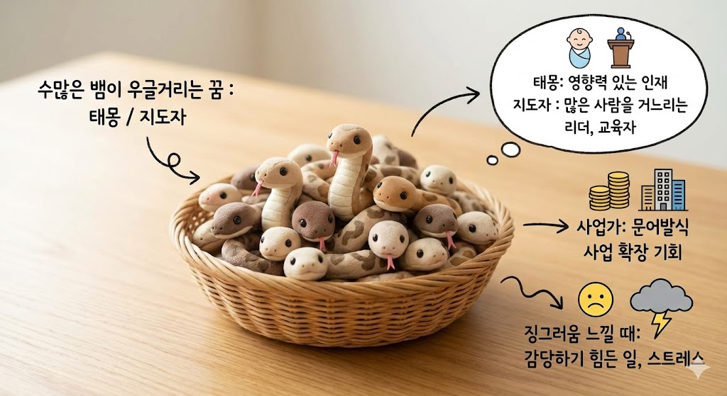 수많은 뱀이 뭉쳐 있거나 우글거리는 모습을 보는 것은 태몽이거나 지도자가 될 징조입니다. 많은 사람을 거느리는 리더가 되거나 교육자가 될 수 있습니다. 태몽이라면 장차 많은 사람에게 영향력을 미치는 인재가 태어날 것입니다. 사업가라면 문어발식으로 사업을 확장하게 될 기회가 찾아옵니다. 하지만 징그러움을 느꼈다면 감당하기 힘든 일이 동시다발적으로 터져 스트레스를 받을 수 있습니다.