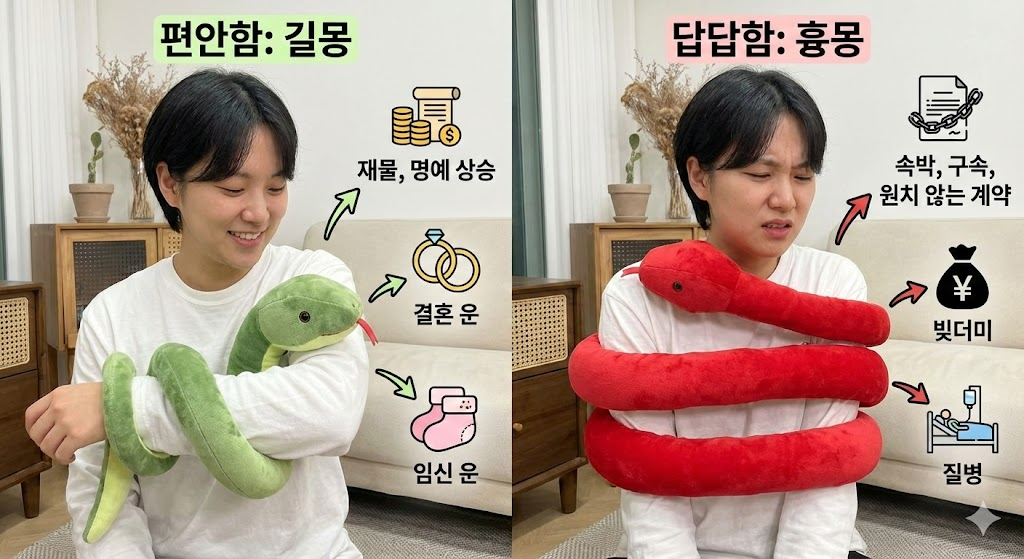 뱀이 몸을 감았을 때 답답하지 않고 편안했다면 재물이 들어와 쌓이고 명예가 드높아짐을 의미합니다. 결혼 운이나 임신 운이 따르기도 합니다. 하지만 뱀이 몸을 너무 세게 조여 숨이 막히거나 고통스러웠다면, 이는 속박과 구속을 의미합니다. 원치 않는 계약에 묶이거나, 빚더미에 앉거나, 질병으로 인해 병석에 눕게 될 수 있습니다.