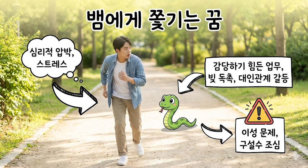 뱀에게 쫓기며 공포심을 느꼈다면, 이는 심리적인 압박과 스트레스를 반영합니다. 감당하기 힘든 업무, 빚 독촉, 혹은 대인관계에서의 갈등으로 인해 마음이 불안한 상태입니다. 현실에서 해결되지 않은 문제들이 꿈속에서 뱀의 형상으로 나타나 자신을 괴롭히는 것입니다. 또한, 이성 문제로 인한 구설수에 휘말릴 수 있으니 행동거지를 조심해야 합니다.