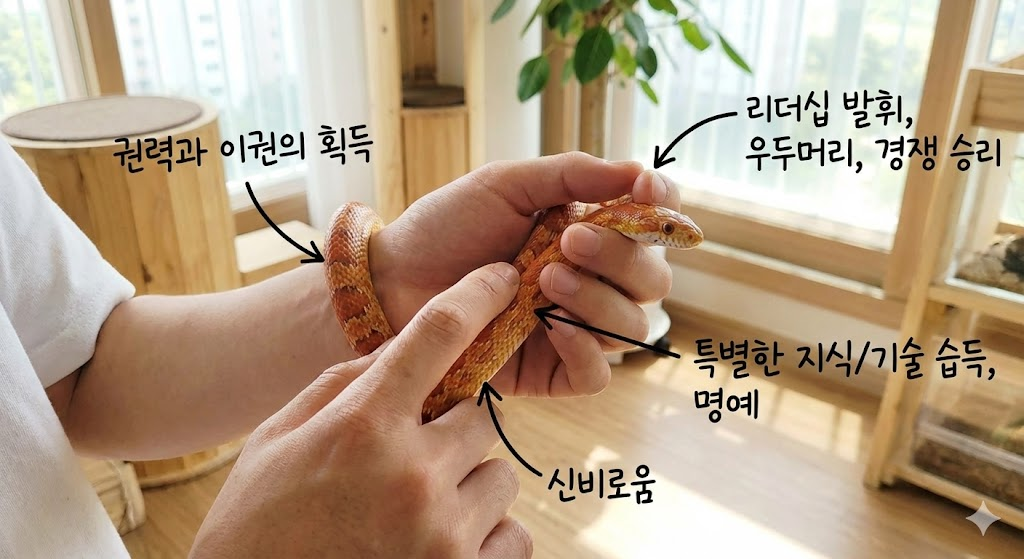 도망가는 뱀을 잡거나, 뱀을 손으로 꽉 쥐는 꿈은 권력과 이권의 획득을 상징합니다. 뱀의 머리를 잡는 것은 리더십을 발휘하여 조직의 우두머리가 되거나 경쟁에서 승리함을 의미합니다. 차가운 뱀의 비늘을 만지며 신비로움을 느꼈다면, 이는 남들이 모르는 특별한 지식이나 기술을 습득하여 명예를 얻게 될 것임을 암시합니다.