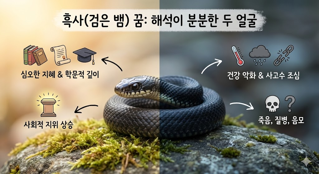 검은 뱀은 해석이 분분합니다. 긍정적으로는 심오한 지혜와 학문적 깊이를 상징하여 학자나 연구자에게 좋은 꿈입니다. 하지만 부정적으로는 죽음, 질병, 음모를 뜻하기도 합니다. 꿈속 분위기가 어둡고 음산했다면 건강 악화나 사고수를 조심해야 하며, 반대로 검은 뱀이 위풍당당하게 느껴졌다면 사회적 지위가 높아질 징조로 봅니다.
