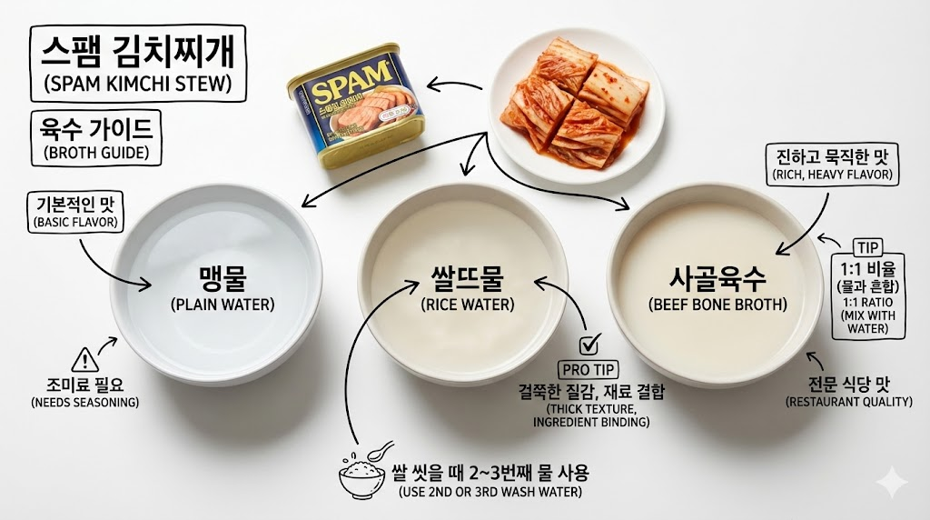 맛집의 비밀은 육수에 있습니다. 맹물로 끓여도 스팸 자체의 맛 때문에 기본은 하지만, 전분기 있는 쌀뜨물을 사용하면 국물이 겉돌지 않고 재료와 양념이 착 달라붙는 걸쭉한 질감을 낼 수 있습니다. 쌀을 씻을 때 두 번째나 세 번째 씻은 물을 받아두세요.