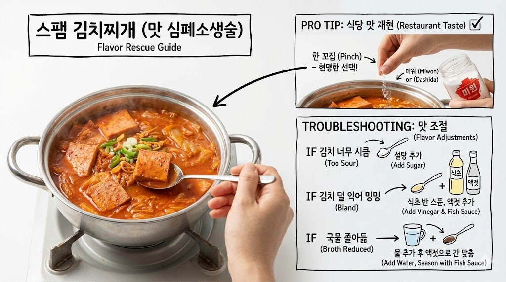 열심히 끓였는데 뭔가 2% 부족한 맛이 난다면? 너무 걱정하지 마세요. 우리에겐 마법의 가루가 있습니다. 식당 맛을 100% 재현하고 싶다면 미원이나 다시다를 한 꼬집 정도 넣어주세요. 이것은 죄가 아닙니다. 맛있는 한 끼를 위한 현명한 선택입니다.