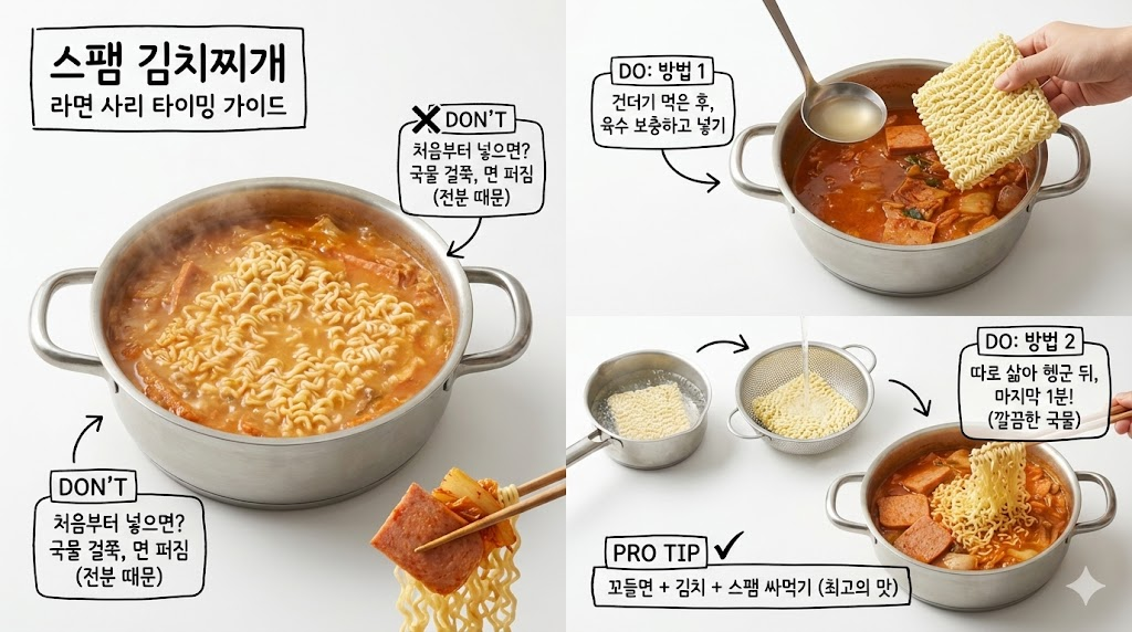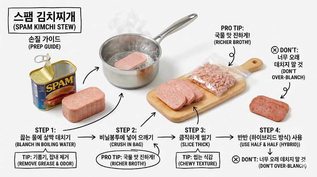 중요한 것은 자르는 방식입니다. 깍둑썰기도 좋지만, 식당처럼 큼직하고 넙적하게 슬라이스하거나, 비닐봉지에 넣고 으깨서 넣는 방법을 추천합니다. 스팸을 으깨서 넣으면 국물에 햄의 맛이 훨씬 빠르고 진하게 우러나와 조리 시간을 단축하면서도 진한 풍미를 낼 수 있습니다. 씹는 식감을 위해 반은 썰고, 반은 으깨는 '하이브리드 방식'이 가장 이상적입니다.
