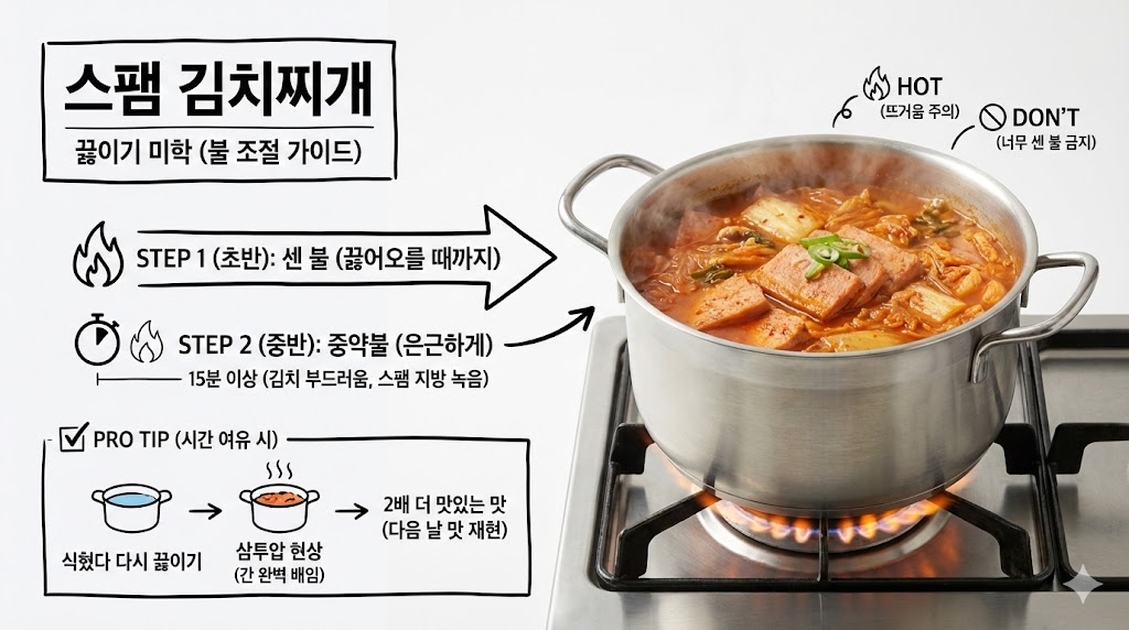김치찌개는 오래 끓일수록 맛있다는 말이 있습니다. 사실입니다. 처음에는 센 불에서 팔팔 끓이다가, 국물이 끓어오르면 중약불로 줄여서 은근하게 15분 이상 끓여주는 것이 포인트입니다. 이 과정을 통해 김치의 섬유질이 부드러워지고, 스팸의 지방이 국물에 녹아들어 진국이 됩니다.