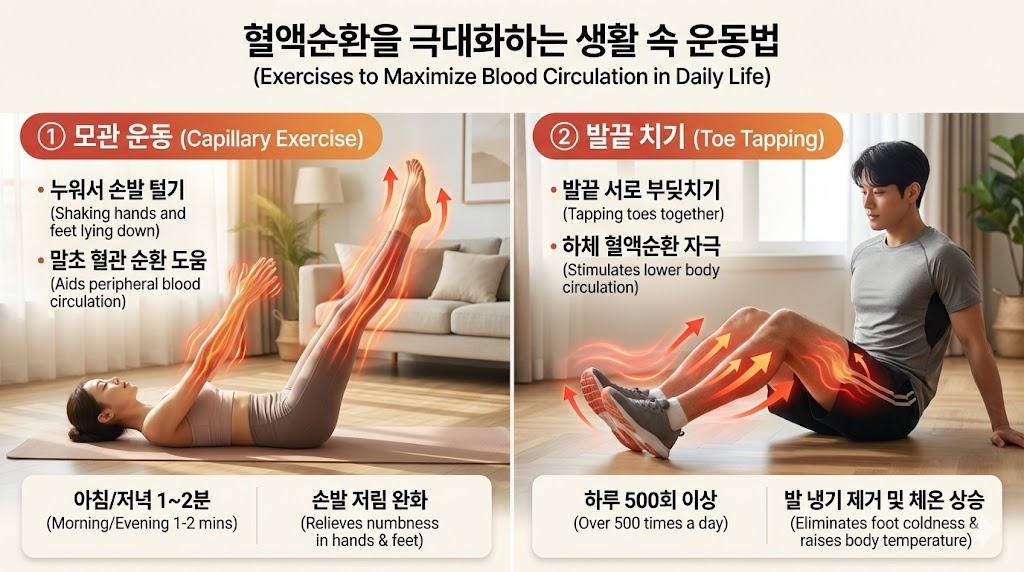 누워서 손과 발을 천장으로 들어 올린 뒤 가볍게 털어주는 모관 운동은 말초 혈관의 순환을 돕는 최고의 운동입니다. 아침 기상 직후와 잠들기 전 1~2분씩만 꾸준히 해도 손발 저림이 크게 완화됩니다.