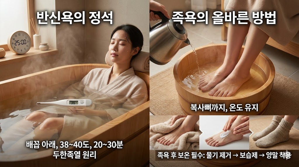 반신욕은 체온보다 약간 높은 38~40도의 물에 배꼽 아래까지만 담그는 것이 정석입니다. 시간은 20~30분 정도가 적당하며, 이마에 땀이 송글송글 맺힐 때쯤 마무리하는 것이 좋습니다. 상체는 차갑게 하고 하체는 따뜻하게 하여 혈액의 대류 현상을 일으키는 '두한족열(頭寒足熱)'의 원리를 이용하는 것입니다. 족욕을 할 때는 복사뼈가 잠길 정도의 물에 발을 담그고, 물이 식지 않도록 뜨거운 물을 보충해주어야 합니다. 족욕 후에는 반드시 물기를 완전히 제거하고 보습제를 바른 뒤 양말을 신어 보온을 유지해야 효과가 지속됩니다.