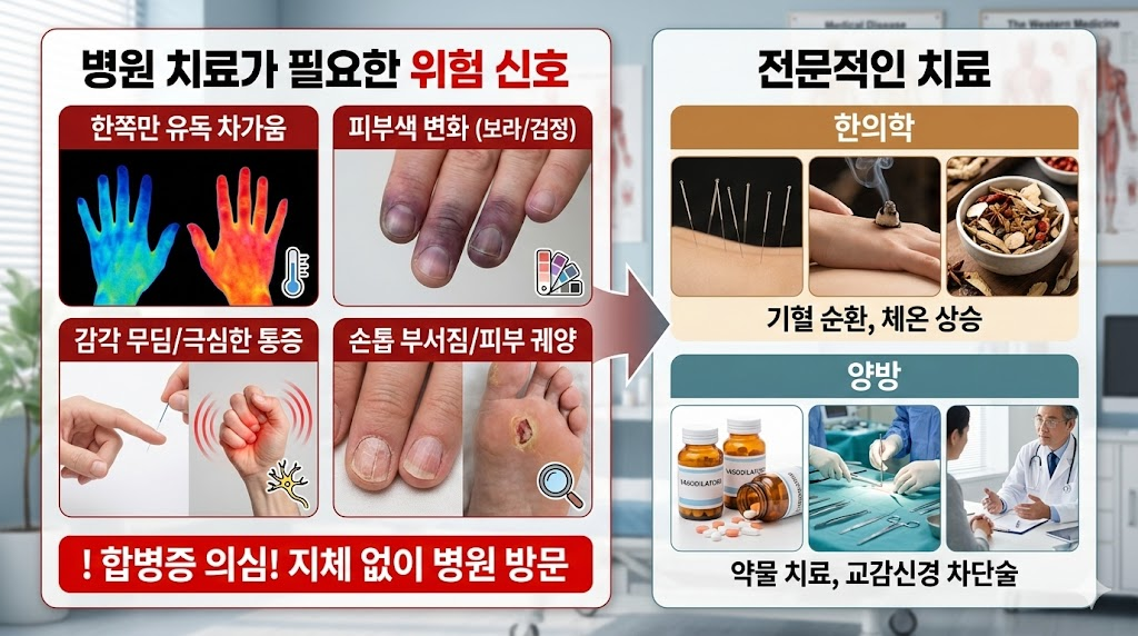 생활 습관 개선으로도 증상이 호전되지 않는다면 전문적인 치료가 필요할 수 있습니다. 한의학에서는 침, 뜸, 한약을 통해 기혈 순환을 돕고 몸을 따뜻하게 하는 치료를 진행합니다. 양방에서는 혈관 확장제나 칼슘 채널 차단제 등의 약물을 처방하거나, 심한 경우 교감신경 차단술을 고려하기도 합니다.