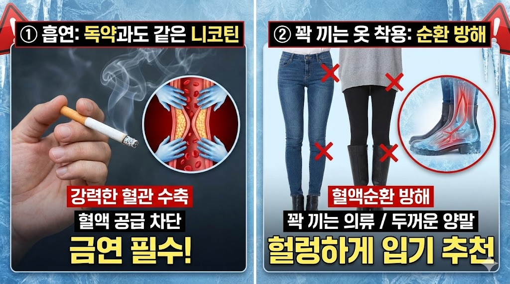 담배는 수족냉증 환자에게 독약과도 같습니다. 니코틴은 흡입 즉시 혈관을 강력하게 수축시켜 혈액 공급을 차단합니다. 실제로 흡연자는 비흡연자에 비해 수족냉증 및 버거씨병(폐쇄성 혈전혈관염) 발병 위험이 월등히 높습니다. 치료를 원한다면 금연은 선택이 아닌 필수입니다.