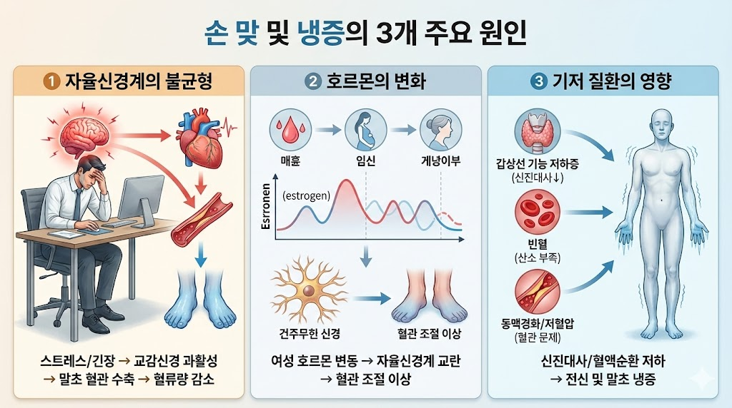 수족냉증의 원인은 매우 다양하지만, 크게 세 가지 카테고리로 나눌 수 있습니다. 원인을 정확히 파악해야 올바른 대처가 가능합니다.