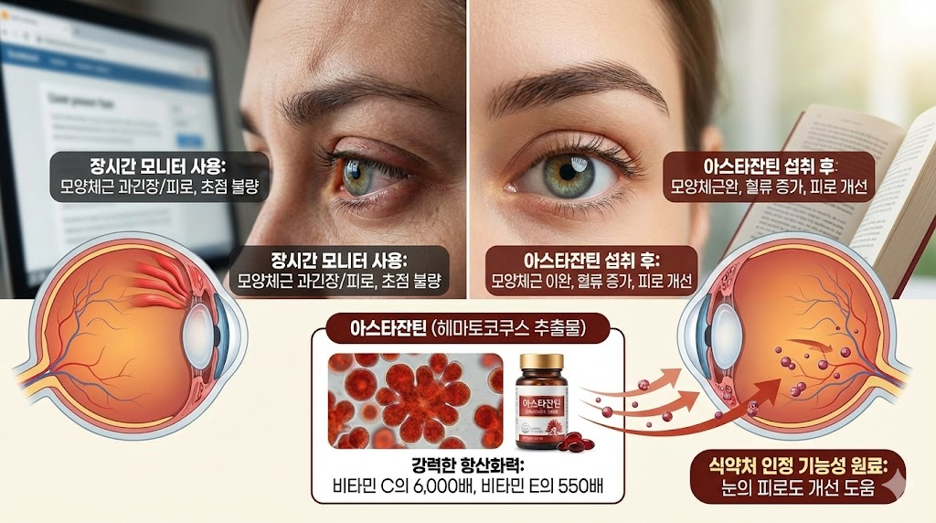 장시간 모니터를 보거나 책을 읽을 때 눈이 침침하고 초점이 잘 맞지 않는 경험을 해보셨을 것입니다. 이는 수정체의 두께를 조절하여 초점을 맞추는 근육인 '모양체근'이 과도하게 긴장하고 피로해졌기 때문입니다. 이때 필요한 성분이 바로 아스타잔틴(헤마토코쿠스 추출물)입니다. 아스타잔틴은 강력한 항산화 물질로, 비타민 C의 약 6,000배, 비타민 E의 약 550배에 달하는 항산화력을 가지고 있습니다. 이 성분은 미세 혈관의 혈류량을 증가시켜 모양체근에 충분한 영양과 산소를 공급하고, 굳어진 근육을 이완시켜 눈의 피로도를 낮추는 데 탁월한 효과를 보입니다. 특히 하루 종일 컴퓨터 작업을 하는 직장인이나 공부하는 수험생들에게 아스타잔틴은 초점 조절 능력을 개선하는 데 큰 도움을 줄 수 있습니다. 식약처로부터 눈의 피로도 개선에 도움을 줄 수 있음을 인정받은 기능성 원료이기도 합니다.