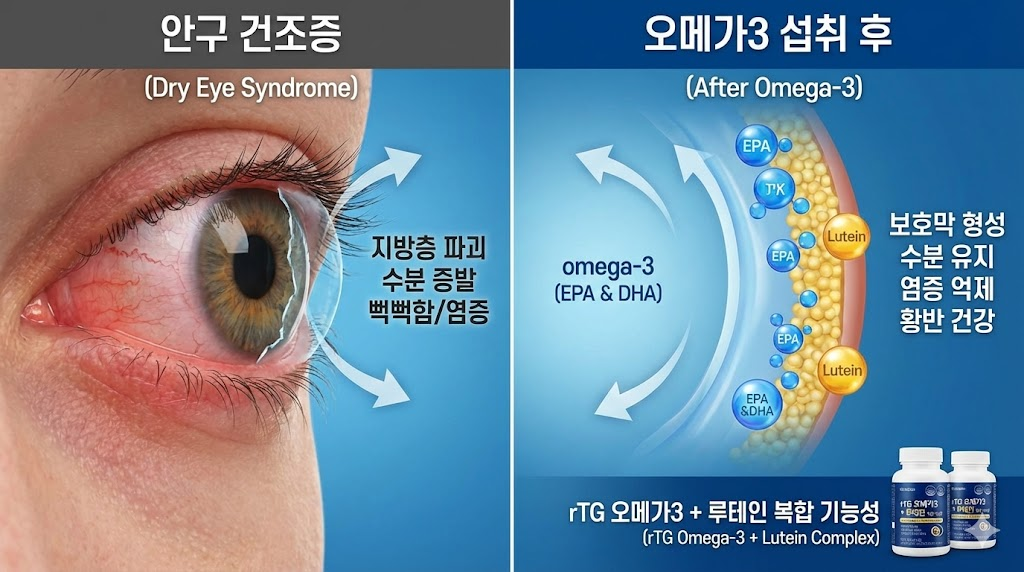 눈이 뻑뻑하고 이물감이 느껴지는 안구 건조증은 눈물의 양이 부족하거나 눈물이 지나치게 빨리 증발하여 발생합니다. 눈물층은 점액층, 수성층, 지방층으로 구성되어 있는데, 이 중 지방층은 수분의 증발을 막아주는 보호막 역할을 합니다. 오메가3(EPA 및 DHA 함유 유지)는 이 지방층을 튼튼하게 만들어 눈물이 쉽게 마르지 않도록 도와줍니다. 또한 오메가3의 항염증 작용은 눈 표면의 염증을 억제하여 건조증으로 인한 통증과 불편함을 완화시킵니다. 시중에는 다양한 오메가3 제품이 있지만, 눈 건강을 위해서는 체내 흡수율이 높고 불순물이 적은 rTG 형태의 오메가3를 선택하는 것이 유리합니다. 루테인과 오메가3를 함께 섭취하면 황반 건강과 건조증 개선이라는 두 마리 토끼를 동시에 잡을 수 있어 복합 기능성 제품을 찾는 소비자가 늘고 있습니다.