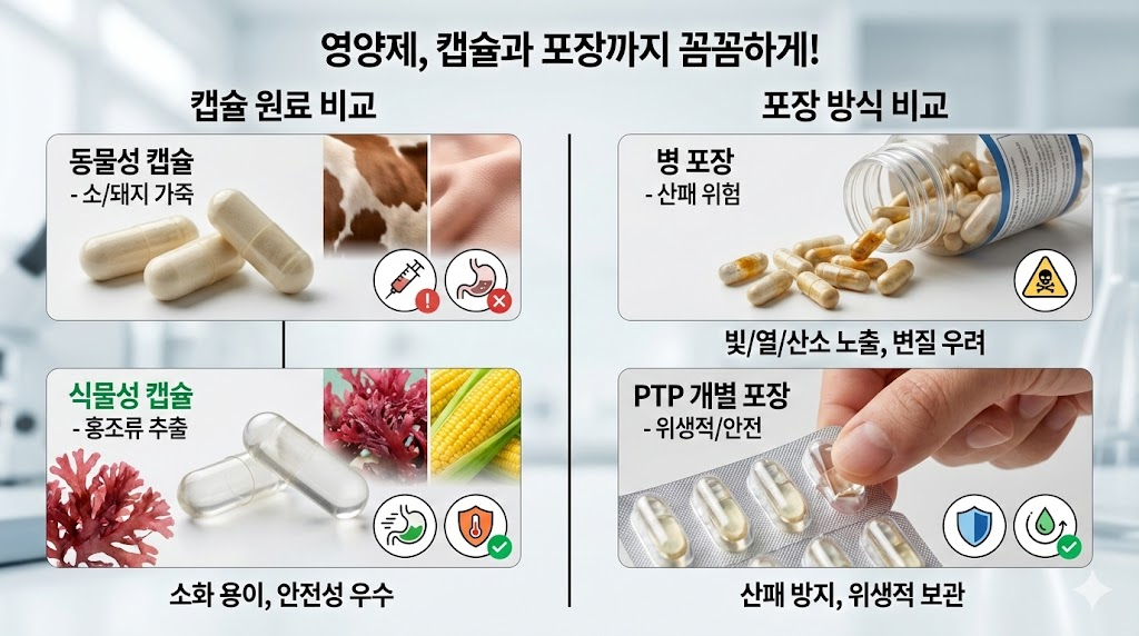 영양제를 감싸고 있는 캡슐의 원료도 꼼꼼히 따져봐야 합니다. 캡슐은 크게 소나 돼지의 가죽으로 만든 동물성 캡슐과 홍조류 등에서 추출한 식물성 캡슐로 나뉩니다. 동물성 캡슐은 사육 과정에서 항생제나 성장촉진제가 사용되었을 가능성을 배제하기 어렵고, 소화가 상대적으로 더딜 수 있습니다. 반면 식물성 캡슐은 체내 소화가 잘 되고 열에 강해 보관이 용이하다는 장점이 있습니다. 또한, 눈 영양제의 주성분인 지질은 빛, 열, 산소에 노출되면 쉽게 산패될 수 있습니다. 산패된 오일은 단순한 영양 손실을 넘어 체내에서 발암 물질로 작용할 수 있으므로 매우 위험합니다. 따라서 병 안에 한꺼번에 들어있는 제품보다는 캡슐 하나하나가 개별 포장된 PTP(Press Through Package) 방식의 제품을 선택하는 것이 위생적이고 산패 위험을 줄이는 방법입니다.