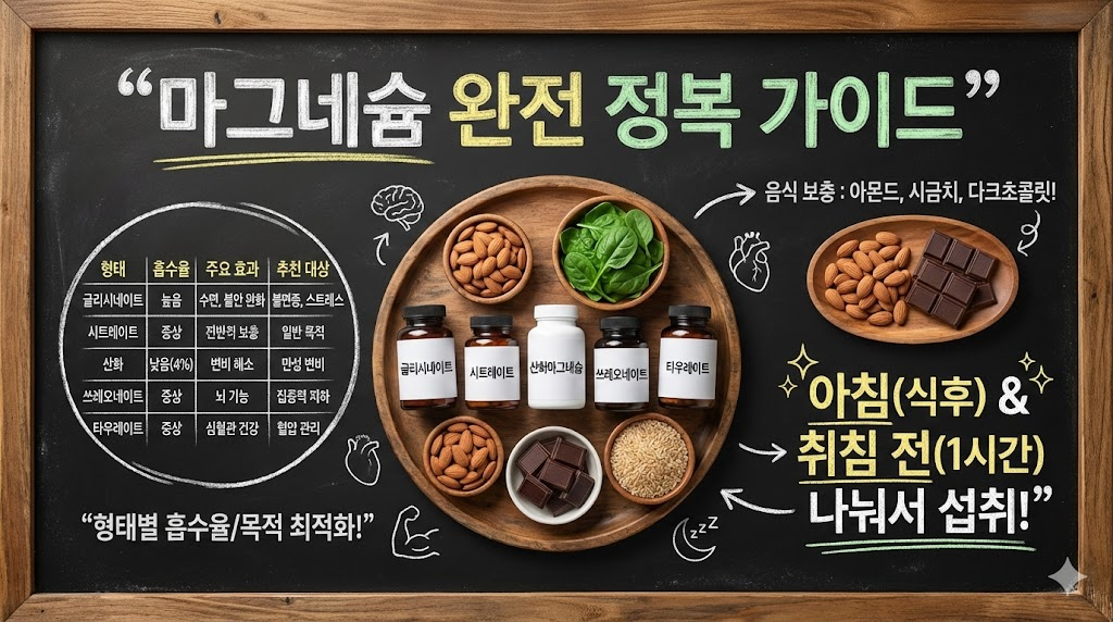 그런데 여기서 정말 중요한 게 있어요. 이 효과는 마그네슘의 "종류"에 따라 완전히 다릅니다. 산화마그네슘은 장 쪽으로 작용하고, 글리시네이트는 흡수율이 높아 신경과 수면에 효과가 집중됩니다. 목적에 맞는 형태를 골라야 한다는 뜻이에요.