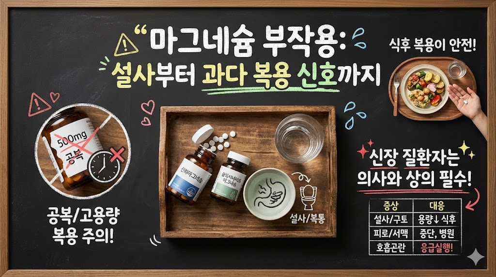| 심한 설사 (하루 3회 이상) | 장 내 마그네슘 과잉 | 용량 절반으로 줄이기 |