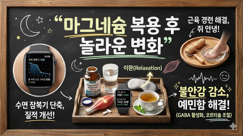 | 마그네슘 글리시네이트 | 높음 | 수면 개선, 불안 완화 | 불면증, 스트레스 과다 |