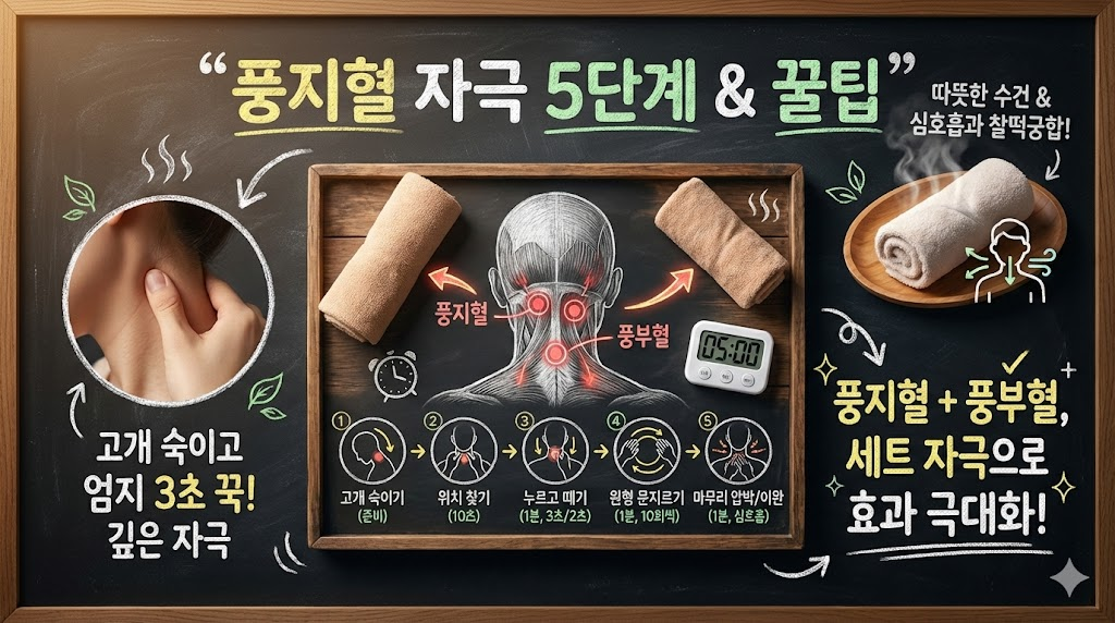 세 번째, 풍지혈만 누르지 말고 바로 옆에 있는 풍부혈(목 중앙선 바로 위 움푹 들어간 곳)까지 함께 자극해 주세요. 이 두 혈자리를 세트로 마사지하면 뒷머리 전체의 혈류가 개선되면서 눈 피로까지 같이 풀리는 느낌을 받을 수 있습니다.