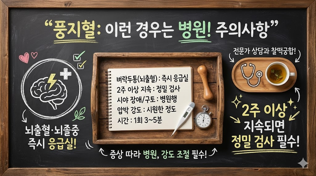 두통이 2주 이상 매일 지속되거나, 갑자기 벼락치듯 극심한 통증이 오거나, 시야 장애나 구토가 동반되면 풍지혈 마사지로 해결할 문제가 아닙니다. 이런 경우는 반드시 신경과나 두통 클리닉에서 정밀 검사를 받아야 합니다.