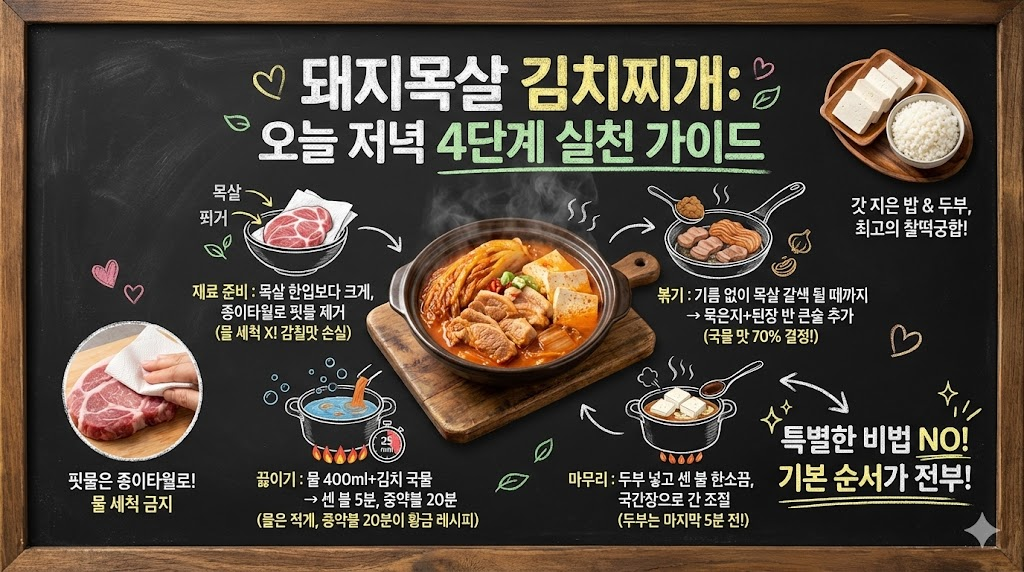 4단계에서 중약불로 줄이는 게 핵심입니다. 센 불로만 계속 끓이면 수분이 너무 빨리 날아가고 김치가 흐물흐물해져요. 중약불에서 20분 이상 은근히 끓여야 목살이 부드러워지면서도 김치 식감이 살아있는 그 절묘한 밸런스가 만들어집니다.