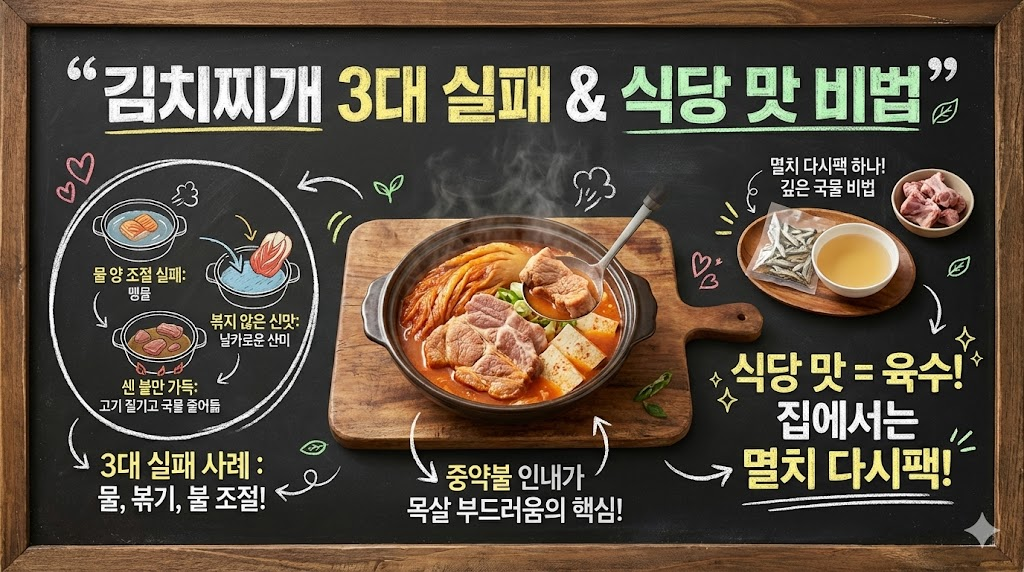 냄비 뚜껑을 여는 순간 코끝을 찌르는 그 묵직한 산미. 김치찌개 한 숟갈을 입에 넣었는데 김치는 퍽퍽하고 고기는 딱딱하고, 국물은 밍밍한 경험 해보신 적 있나요? 사실 저도 처음 혼자 김치찌개를 끓였을 때 그랬습니다. 분명 레시피대로 했는데 어머니가 끓여주시던 그 깊은 맛이 안 나서 세 번이나 버렸어요.