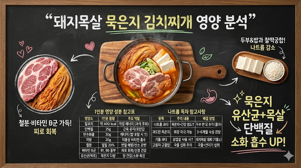 돼지목살의 철분이 혈액 내 산소 운반을 돕고, 묵은지의 발효 과정에서 증가한 비타민 B1과 B6가 피로 회복에 기여합니다. 특히 묵은지 유산균이 고기 단백질 분해를 촉진하기 때문에 소화 흡수율까지 올라갑니다.
